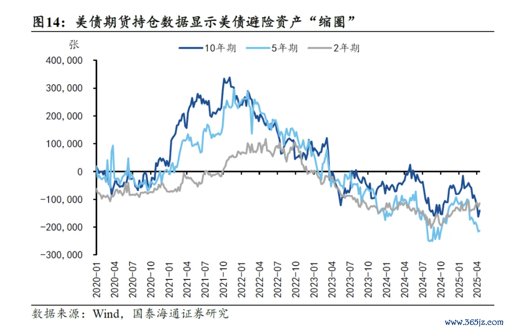 与此同时,美债作为传统避险资产的地位确实受到质疑,表现在避险资产的“缩圈”。一方面,美债期货持仓创下历史最大空头,反映部分投资者对美元资产投下不信任票;另一方面,期限结构有所分化,偏短期国债(2年期)净空头持仓收窄,而中长期国债(5年期和10年期)净空头持仓仍在攀升,表达对美元资产前景的极度不确定性。