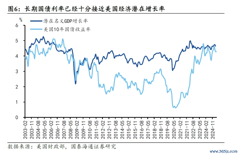 短期国债占比的提升与市场降低投资组合的久期有关。自2023年以来,美国长期国债收益率已经十分接近潜在经济名义增长率,这在一定程度上引起了市场对于美国财政可持续性的担忧,因而选择卖出长久期国债、持有短久期国债,这在近期美债的市场表现中体现得尤为明显。
