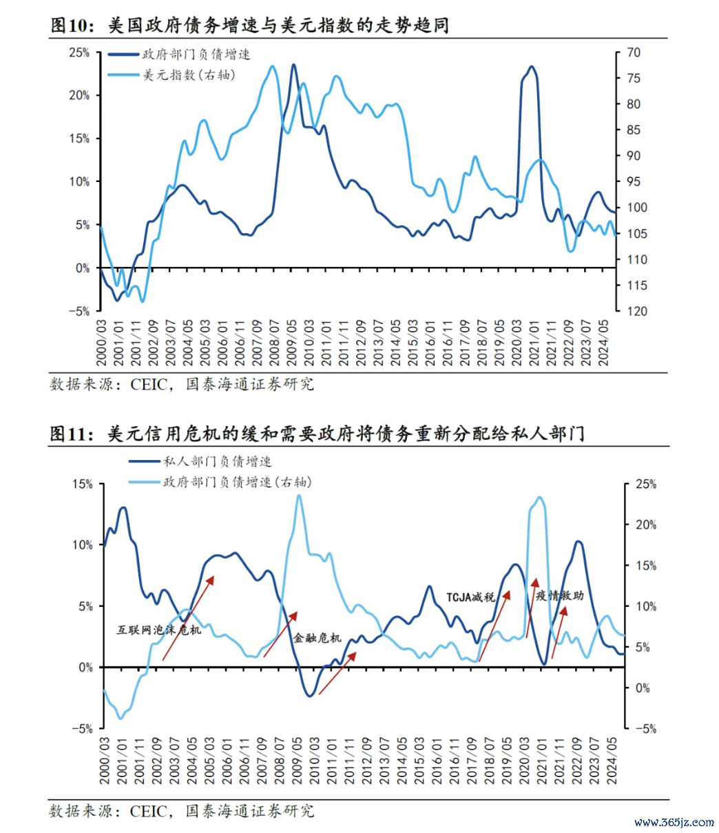 美元并非天然的货币,每当政府债务飙升,都会引发一轮美元信用危机。从中长期来看,美国政府债务增速与美元指数的走势趋同。美元信用危机的缓和需要政府将债务重新分配给私人部门,也就是政府对私人部门的资金注入能够带动实体经济的信用扩张。回头来看,互联网泡沫危机、金融危机、TCJA法案、疫情四轮政府债务的扩张都成功带动了私人部门,但毕竟每轮危机的情景不同,我们无法进行简单的线性推演。