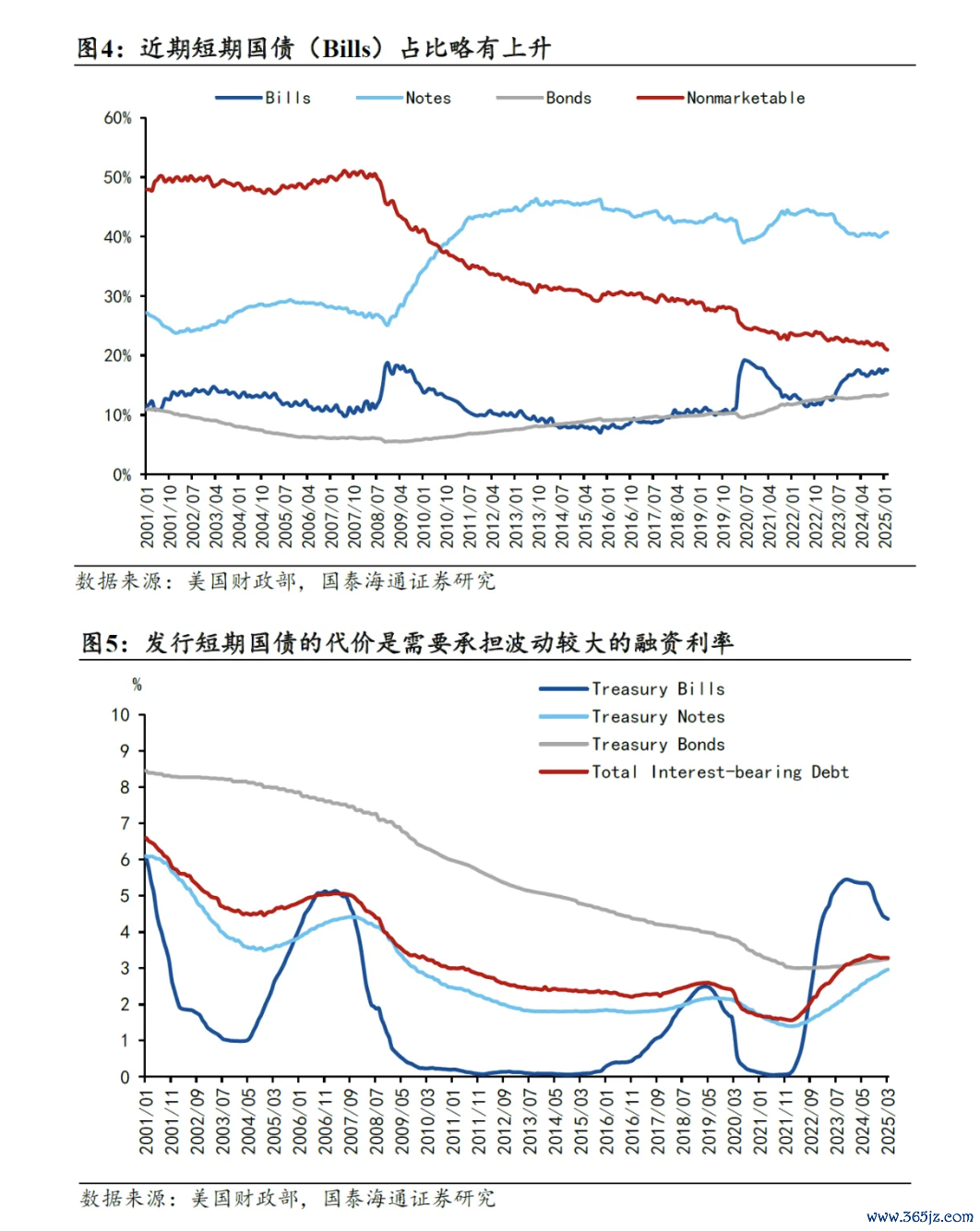 近期美国关税政策引起的美债抛售潮引起了市场对后续美债供给压力、继而对美国财政可持续性的担忧。美债供给压力的确有所攀升,但总体程度可控,不必因此而担忧美债利率上行。此外,财政付息压力也处于可控范围内,没有对其他支出造成明显的挤出效应。然而,美债供给的期限结构确实表现出一定的恶化趋势,短期国债占比接近两次危机时期的高位,其融资利率也处于20年以来的高位。短期国债占比的提升与市场降低投资组合的久期有关,美国长期国债收益率已经十分接近潜在经济名义增长率,这在一定程度上引起了市场对于美国财政可持续性的担忧,因而选择卖出长久期国债、持有短久期国债。