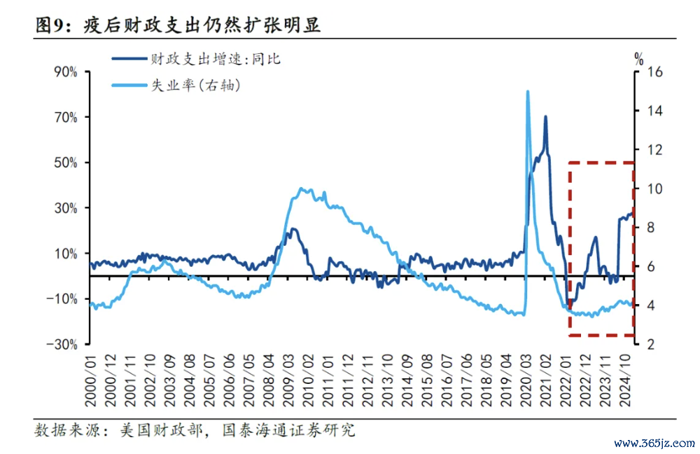具体来看:一是特朗普1.0通过的《减税与就业方案》(Tax Cuts and Jobs Act, TCJA)降低了作为美国财政最大收入来源的所得税,使赤字率快速突破了6%;二是2021年拜登政府通过的三大支出法案(包括《基础设施投资与就业法案》、《芯片与科学法案》、《通胀削减法案》)大幅提升了非必要支出(指需通过年度拨款法案执行的财政支出,主要是非福利支出项目)的增速;三是2022年以来的高通胀环境使得必要支出(主要是福利项目支出)保持高增。