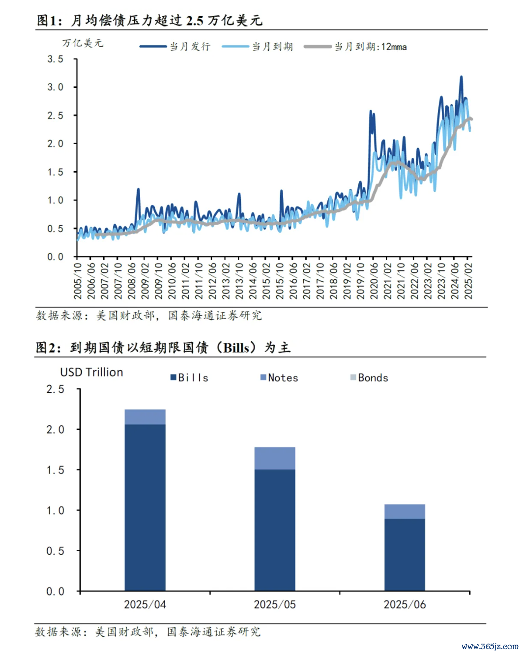近期美国关税政策引起的美债抛售潮引起了市场对后续美债供给压力、继而对美国财政可持续性的担忧。这些担忧主要来自三个方面:1)2025年美债到期继续创下新高,续发压力大;2)近期长期美债利率上行、而美元指数往下指向“去美元化”交易,表明投资者不再将美债看作是绝对的安全资产,取而代之的是不断创下历史新高的黄金;3)美债利率处于高位,财政付息压力较大,对其他支出产生了挤占效应,影响了财政扩张的可持续性。