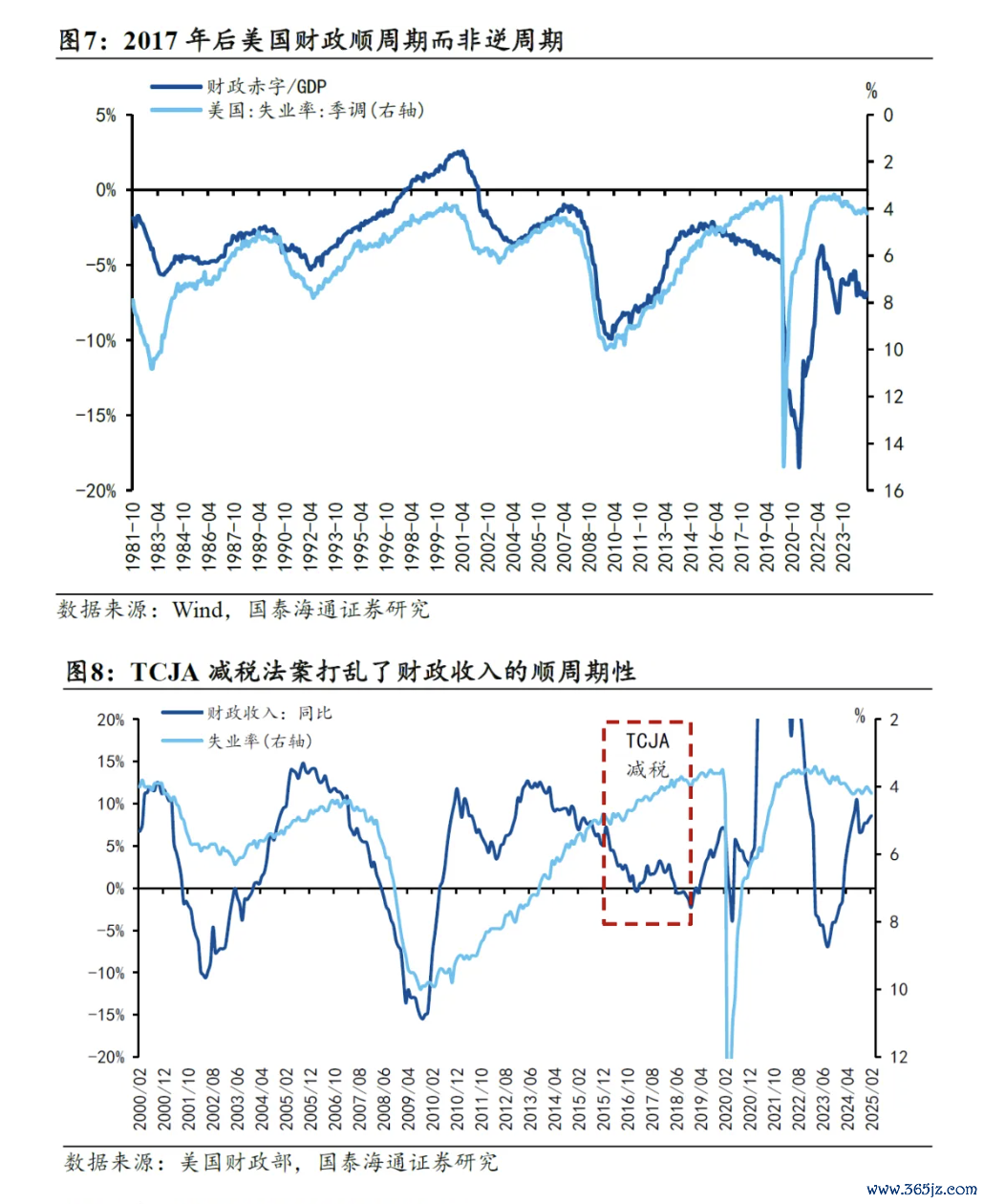 美债供给速度在近年来明显加快的根源在于顺周期财政政策的实施。从美国财政的收入和支出结构来看,其本应有天然的逆周期性:在经济下行期,私人部门收入减少,税收收入下滑,同时失业保险等福利支出上升,财政赤字扩张;反之在经济上行期,税收收入增加,福利支出下降,财政赤字减少。然而从特朗普1.0开始,政治意志而非经济周期占据了财政的主要决定因素,美国财政开始表现出顺周期性:2016-2019年,失业率降低的同时财政赤字却逆势扩张;2022年疫后至今,失业率保持低位但赤字率大幅高于经济处于正常运行状态的水平。