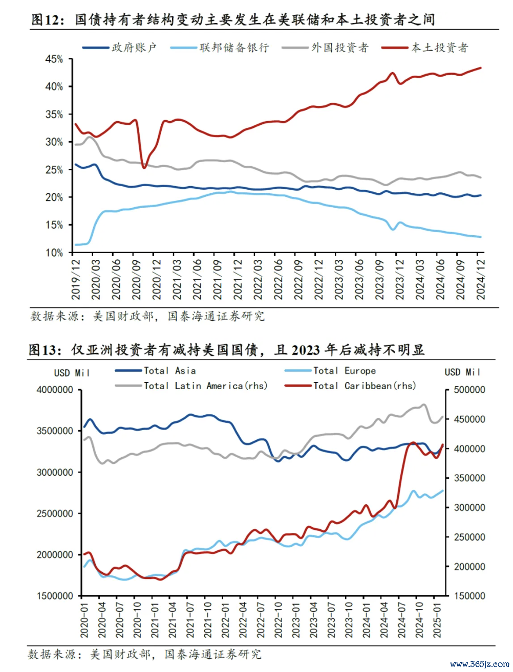 从美债的持有者结构来看,近年来存在部分外国投资者对美债的减持,但主要结构变动发生在美联储和美国国内投资者之间。“去美元化”叙事反映在外国投资者持有美债占比由2020年初的30%下滑至目前的25%,主要减持方为亚洲投资者(日本、中国),且2023年后外国投资者减持不明显,欧洲、拉丁美洲区域表现出明显增持的趋势。自2022年初美联储开启量化紧缩以来,国债从美联储转移到美国本土投资者手中,其持有比例显著上升。因此,局部“去美元化”不能推导出投资者对美债需求的大幅减少。