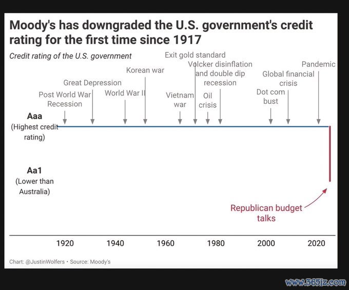 上周五(5月16日),穆迪评级公司宣布将美国政府的最高信用评级从Aaa下调至Aa1,并将评级展望从“稳定”下调为“负面”,此举迅速点燃了业内对美国债务问题的担忧。值得一提的是,作为三大评级机构中最“古老”的一个,自穆迪1917年首次发布信用评级以来,美国此前一直保持着穆迪的最高信用评级,这也意味着其坚守了长达108年的AAA金身在这一次彻底告破。